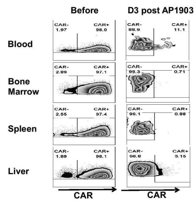 图4 药物诱导处理前后小鼠体内CAR-NK细胞比例的流式检测结果