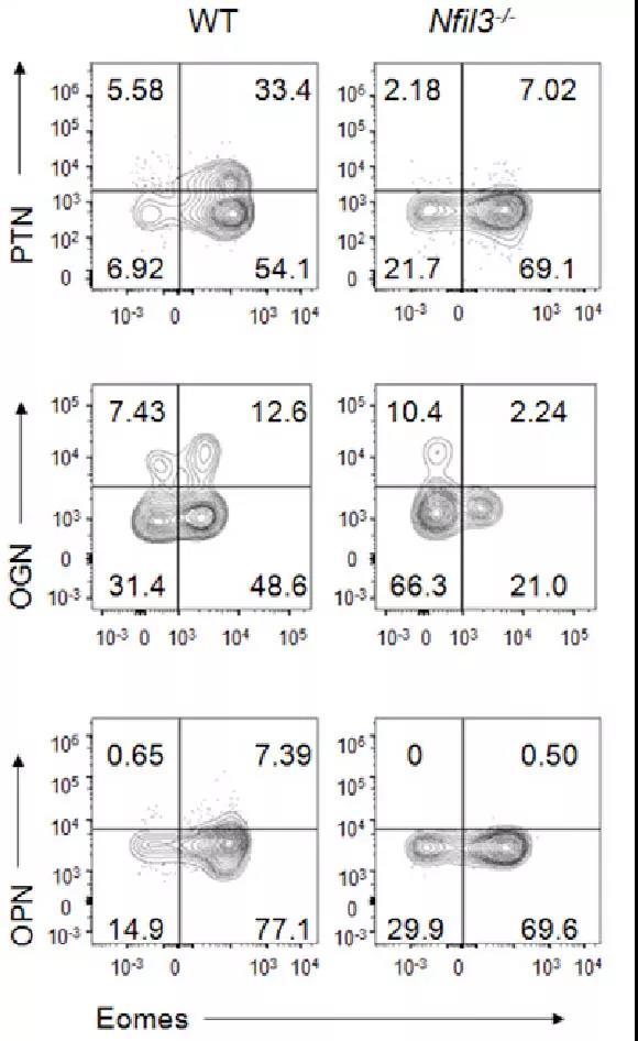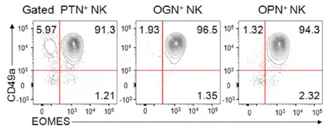 图1 人体内存在可分泌PTN、OGN、OPN的CD49a+Eomes+NK细胞亚群