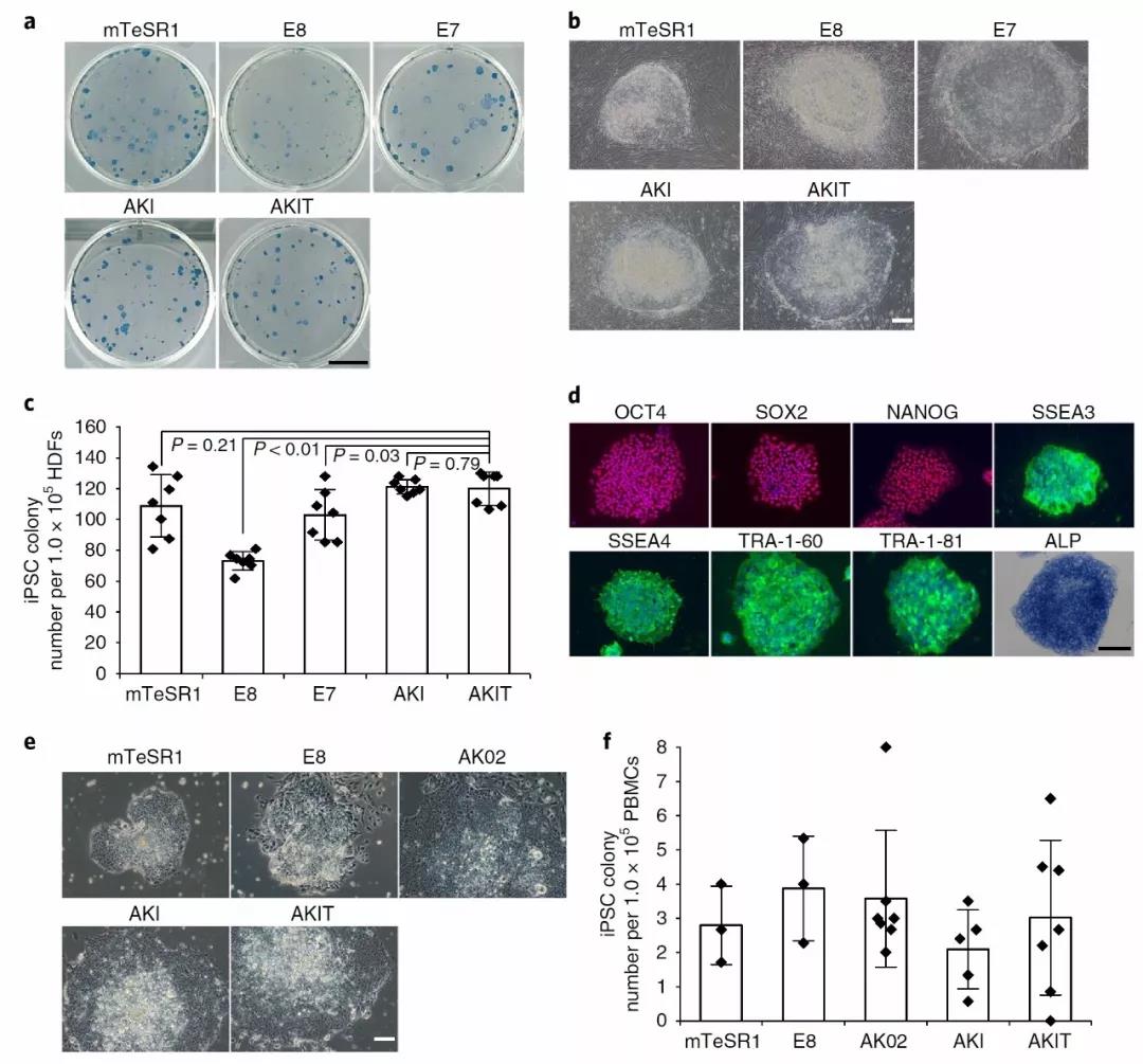 本研究中,研究人员鉴定出了能够替代hPSC培养基中Wnt蛋白的化合物,以及其它可促进细胞增殖的化合物,开发出了一种不含生长因子、只含有三种化学成分的hPSC培养基AKIT培养基。通过对染色体核型、多能性标志物的表达及三胚层细胞分化能力的检测,证明了该培养基可支持hPSC的长期增殖(图1)。另外,与含有生长因子的培养基相比,该培养基培养的hPSC对糖酵解途径的依赖性更小。此外,该培养基还可用于人真皮成纤维细胞或外周血单个核细胞来源的诱导性多能干细胞的产生(图2)。