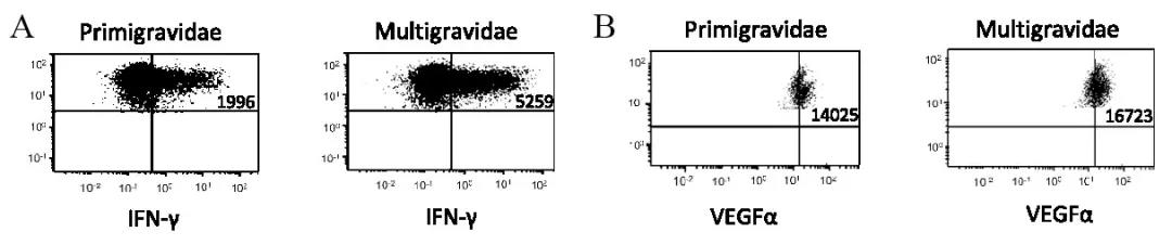 图2 多次妊娠子宫内PTdNKs细胞IFN-γ和VEGFα的表达水平增加