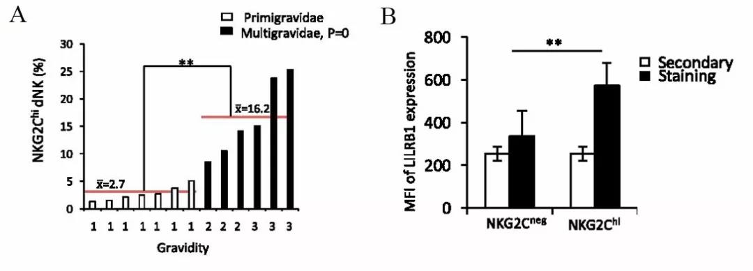 图1 反复妊娠子宫内NK细胞高表达NKG2C和LILRB1