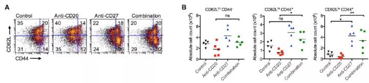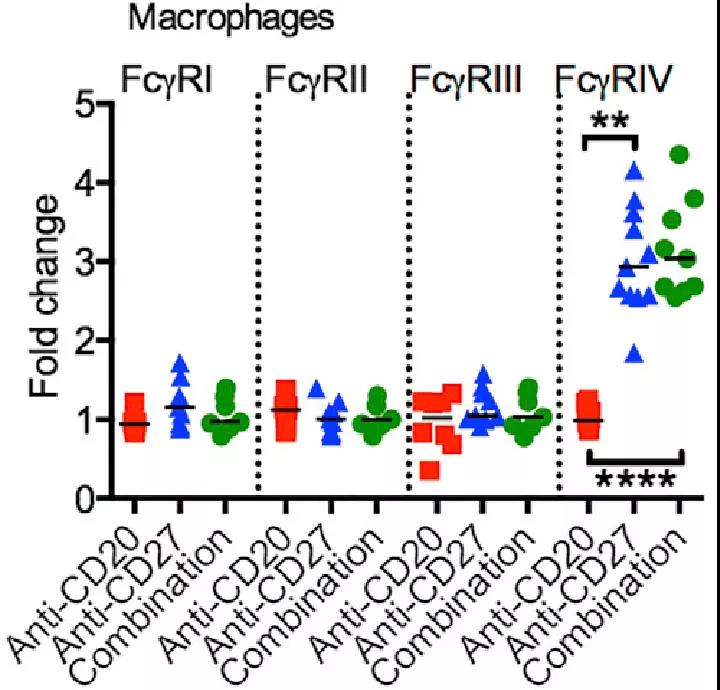单克隆抗体(monoclonal antibodies,mAbs)可以通过募集效应细胞(如髓系细胞)或靶向免疫调节受体,促进细胞毒性T细胞反应,从而摧毁肿瘤。本研究测试了一种肿瘤靶向抗体——CD20抗体与其它免疫调节mAbs联合使用治疗肿瘤的潜力。结果显示只有CD27/CD20抗体组合可以有效杀伤肿瘤,这一结论在多个淋巴瘤模型中得到了证实(图1)。进一步分析结果表明CD27抗体可以促进CD8+ T细胞的活化(图2),促进CD8+ T细胞和自然杀伤细胞释放髓系细胞趋化因子和γ干扰素(图3),最终促进髓系细胞渗透(图4)和巨噬细胞的活化(图5),提高抗肿瘤效果。