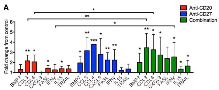 T细胞和NK细胞表面CD27的刺激可提高趋化因子和IFN-γ的释放;