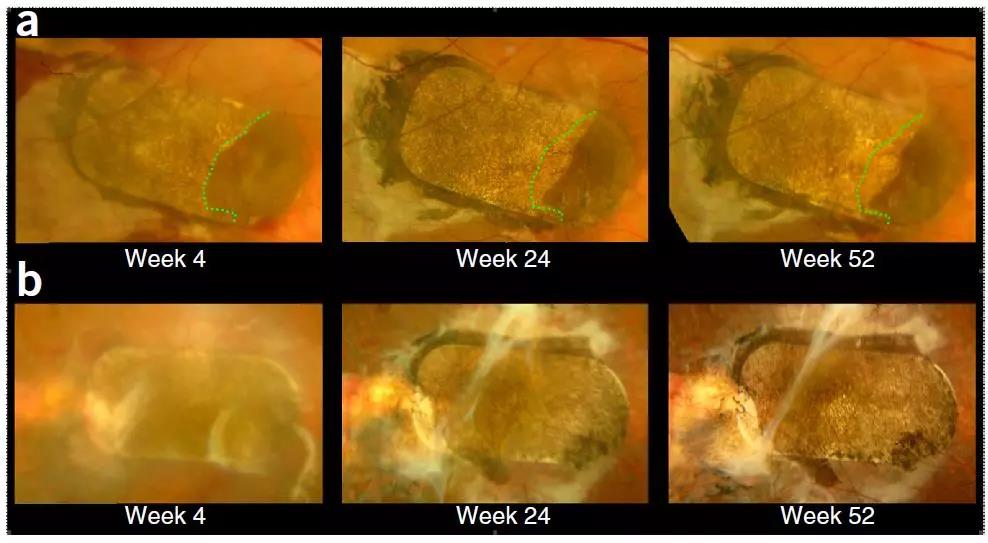图2 两名患者hESC-RPE贴片移植后的彩色图像
