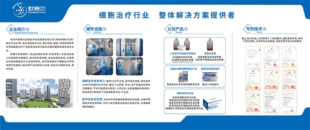 深圳市默赛尔生物医学科技发展有限公司(简称默赛尔生物)成立于2014年4月,是为生物技术公司、医疗机构、高校、科研院所提供全领域细胞治疗产品和系统性技术解决方案的国家级高新技术企业。默赛尔生物自成立以来,大力加强技术研发,取得了多项发明专利,公司从细胞提取,到培养、储存全流程所使用的产品与技术,均具有自主知识产权,不仅为广大的生物技术公司提供全面优质的细胞治疗综合解决方案,还提供系列产品与技术服务,包括细胞治疗所需的各种细胞因子、培养液。